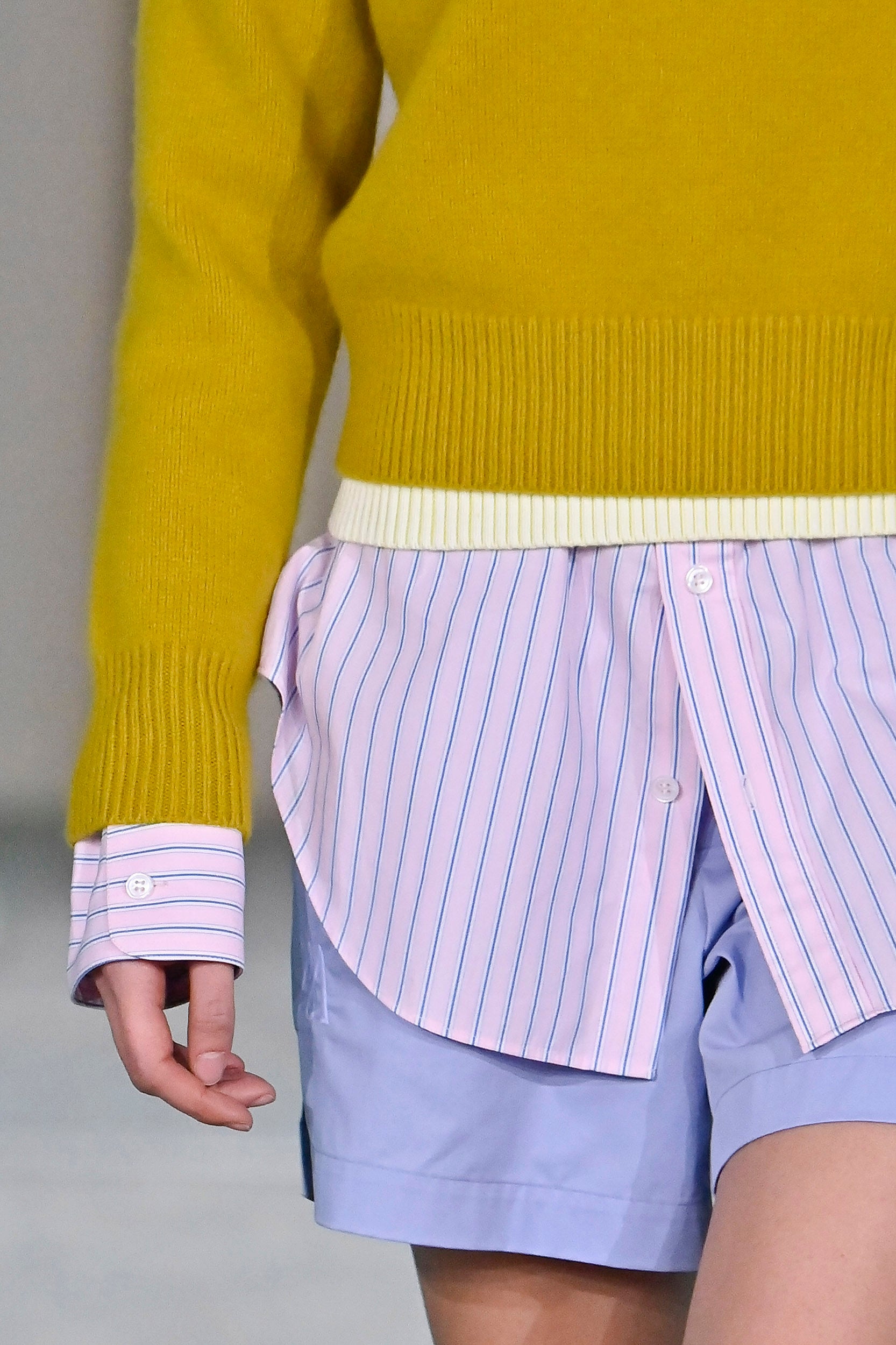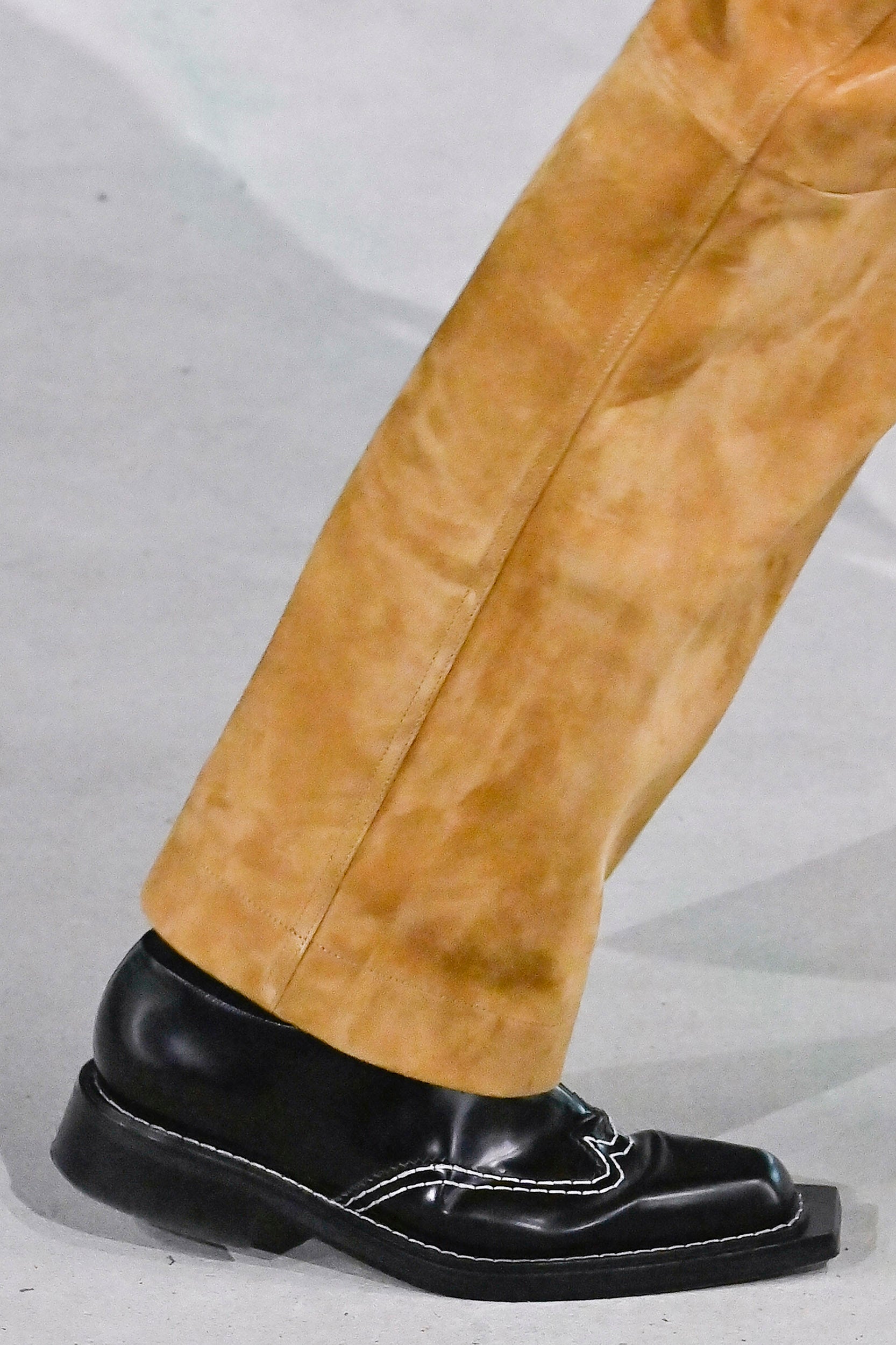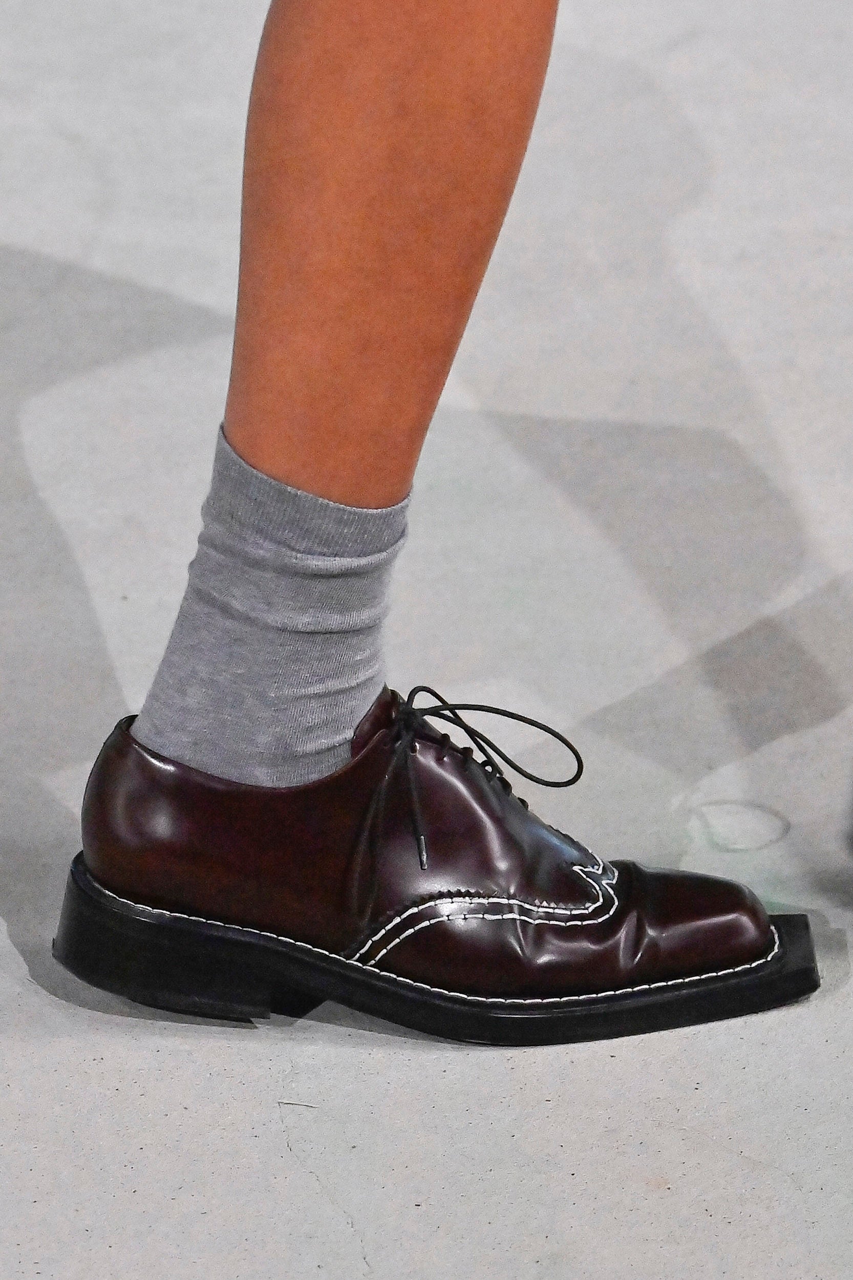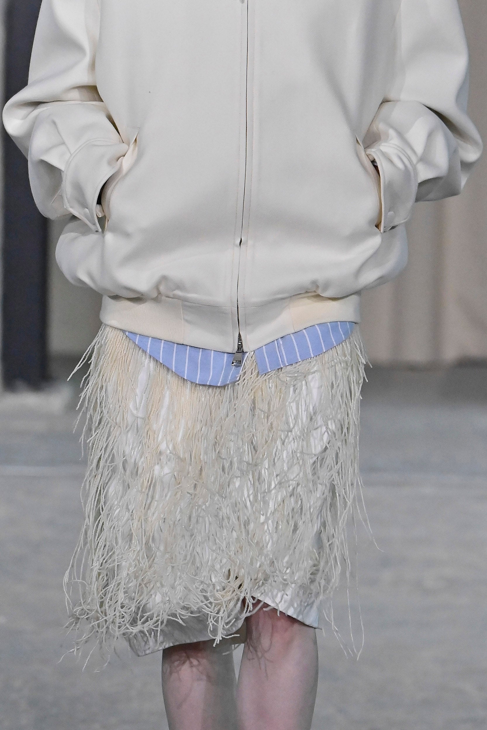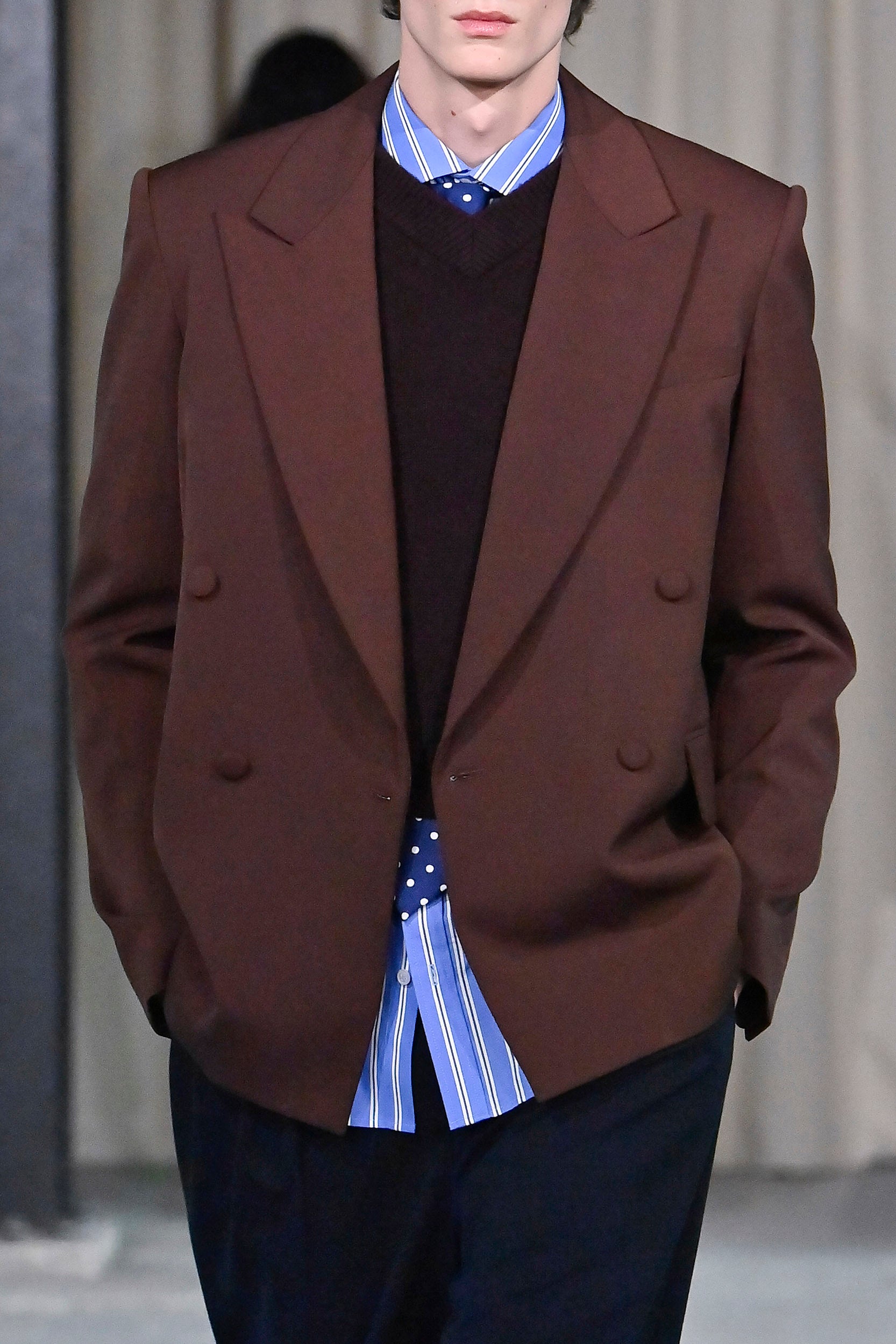 Saccharine pastels clash with rich leathers and wools, while full skirts balance strong-shouldered tailoring. Classic British wardrobe staples are reimagined, layering nostalgia with modernity. Eccentric textures, and playful contrasts redefine tradition, embracing a multifaceted reality.