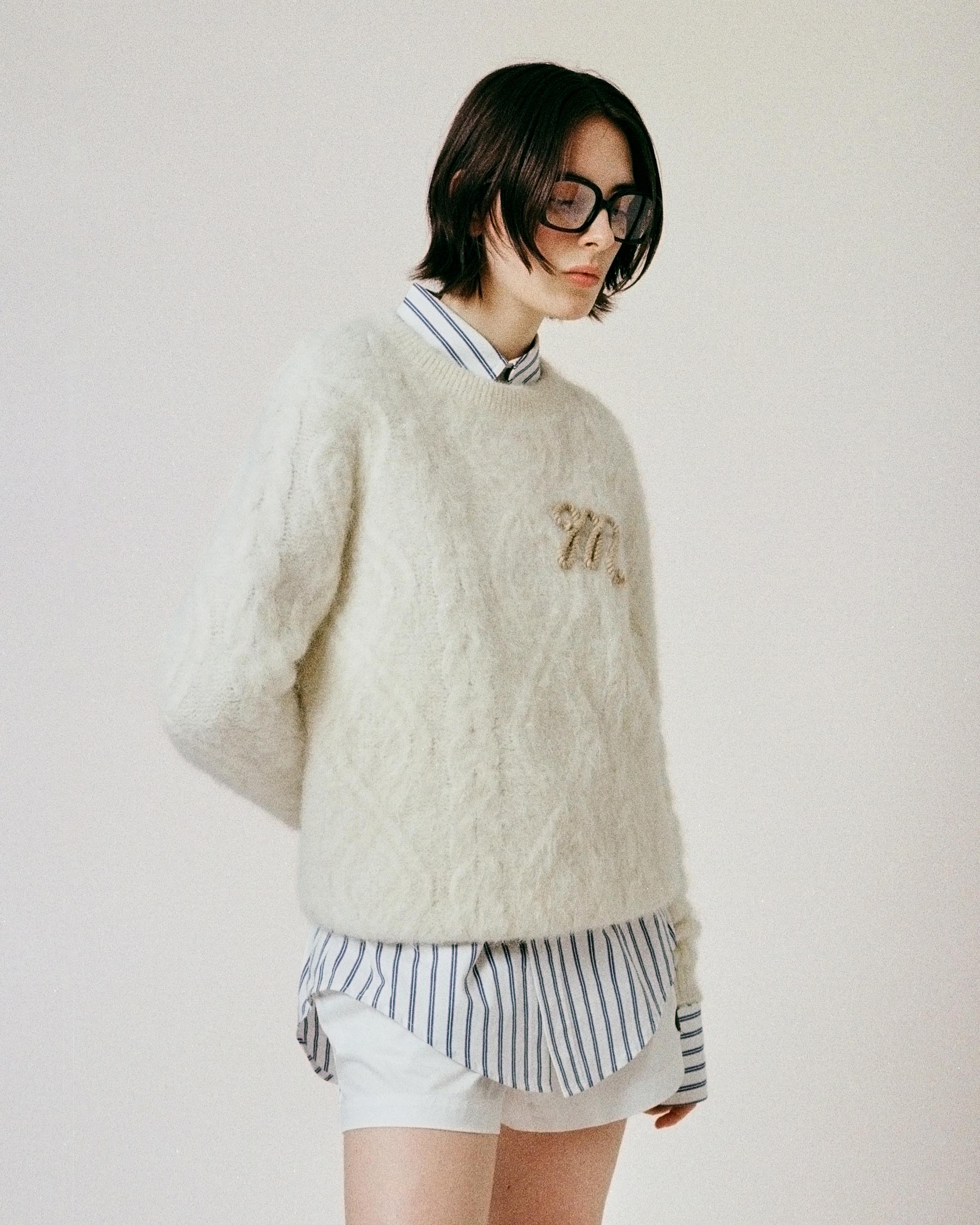 Alexa can be seen wearing crisp cotton shirting and boxy tailoring as well as a double faced woollen hoodie and fluffy a mohair cable knit decorated with a new M rope motif.