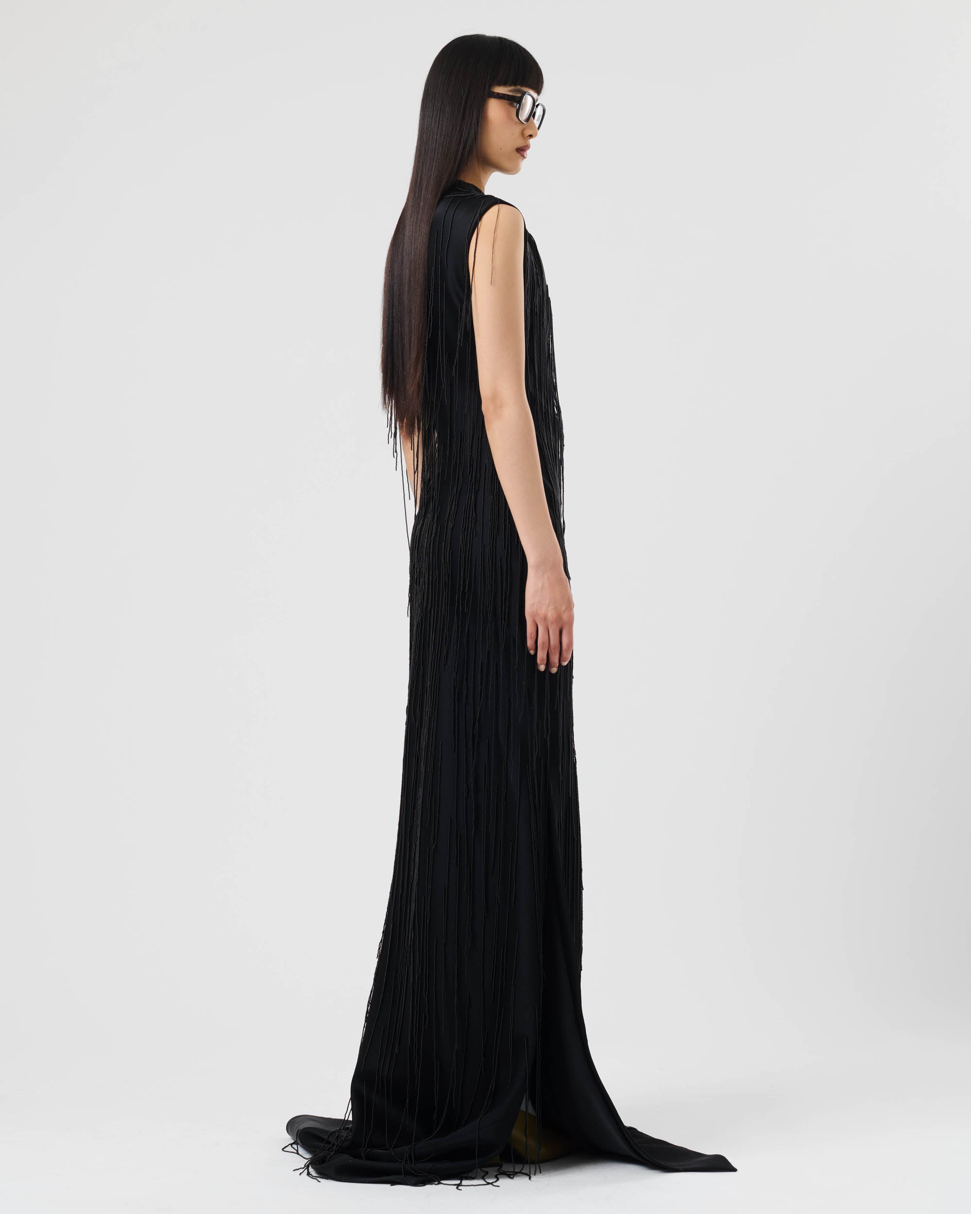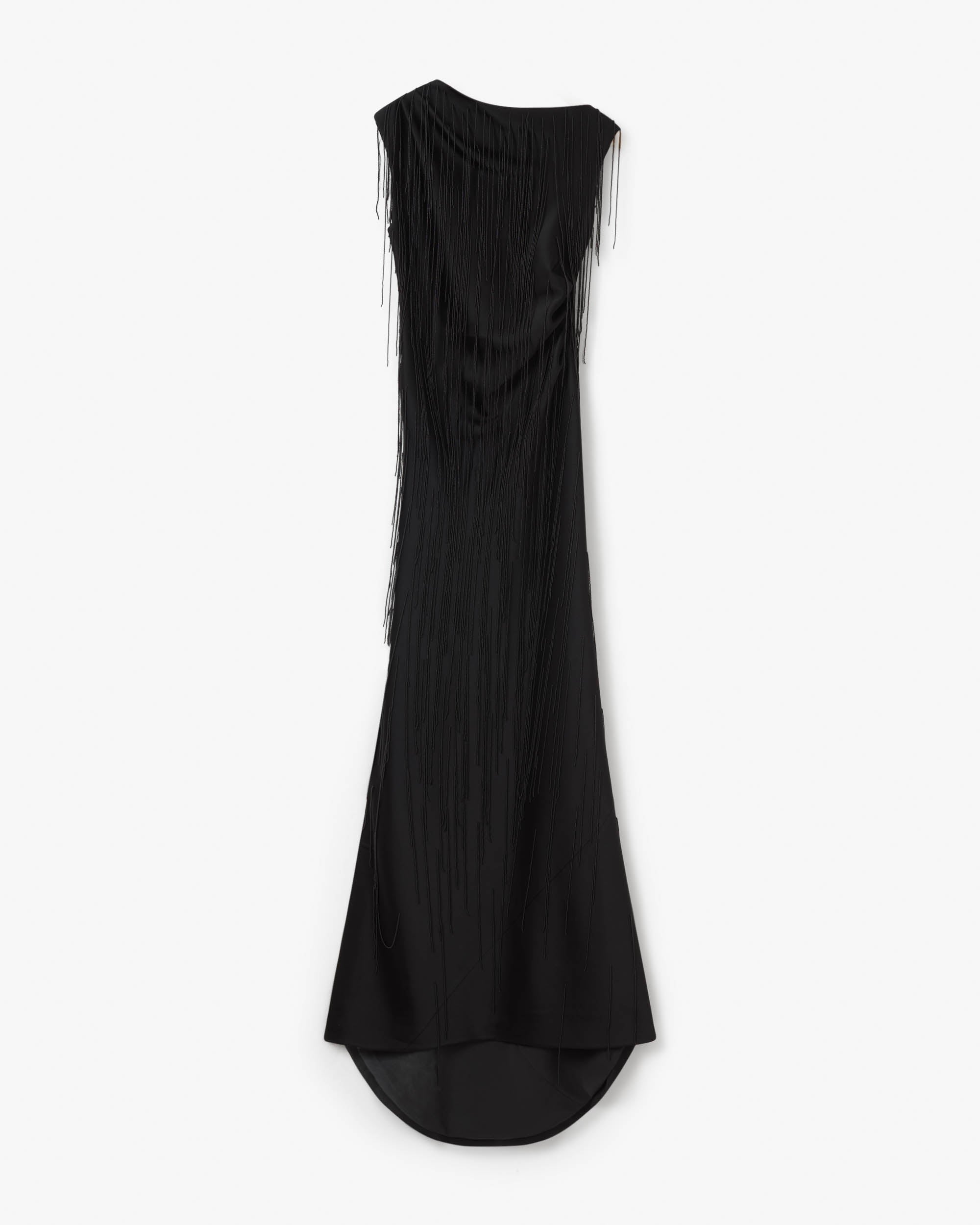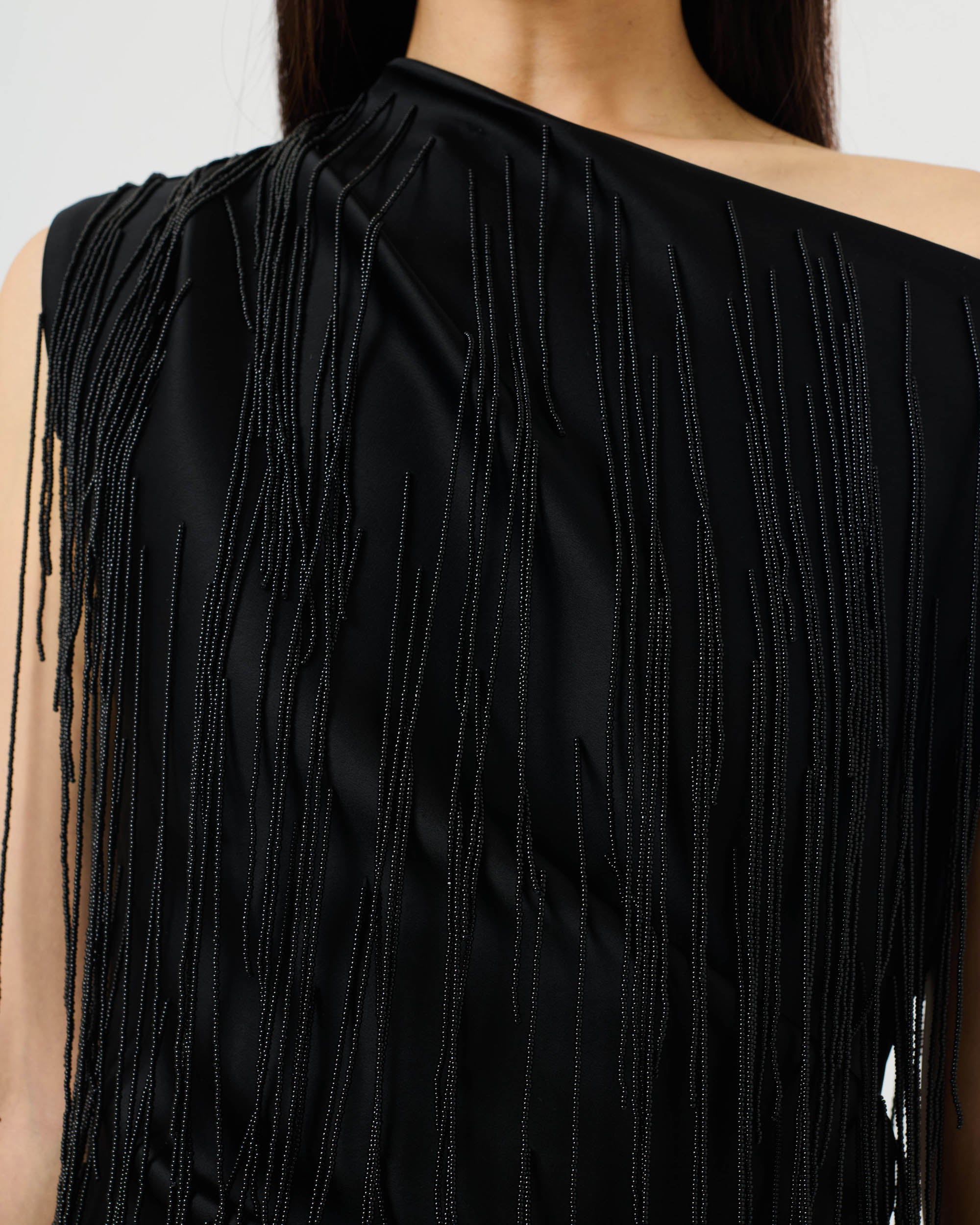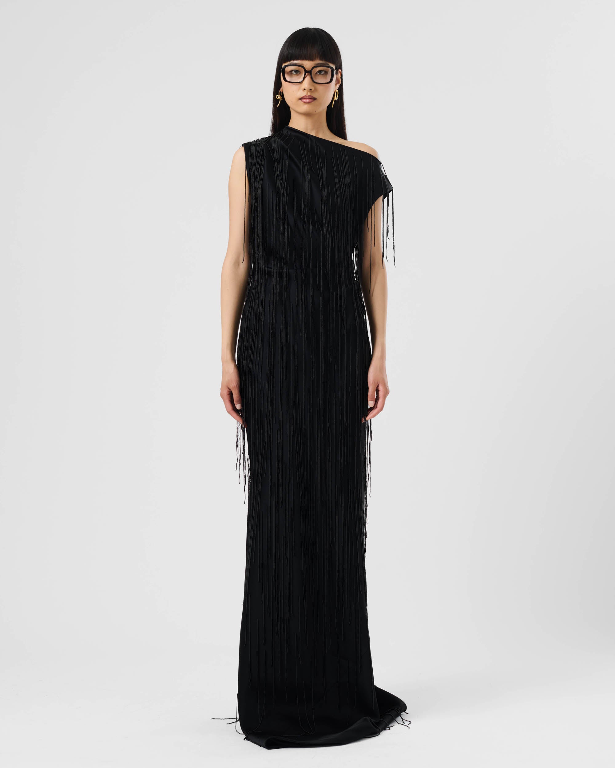 View Similar ProductsAsymmetric dress adorned with beaded fringing and featuring one-shoulder neckline and side slit. Cut to a regular fit and floor-length draped hem.