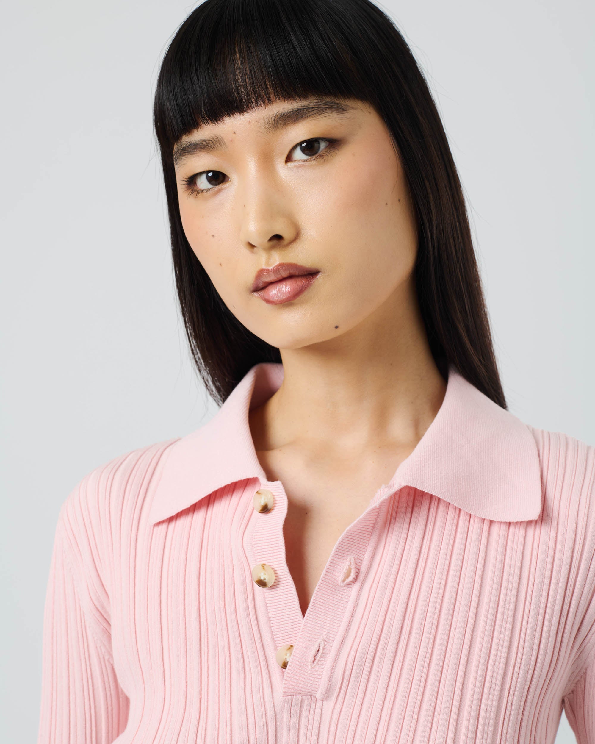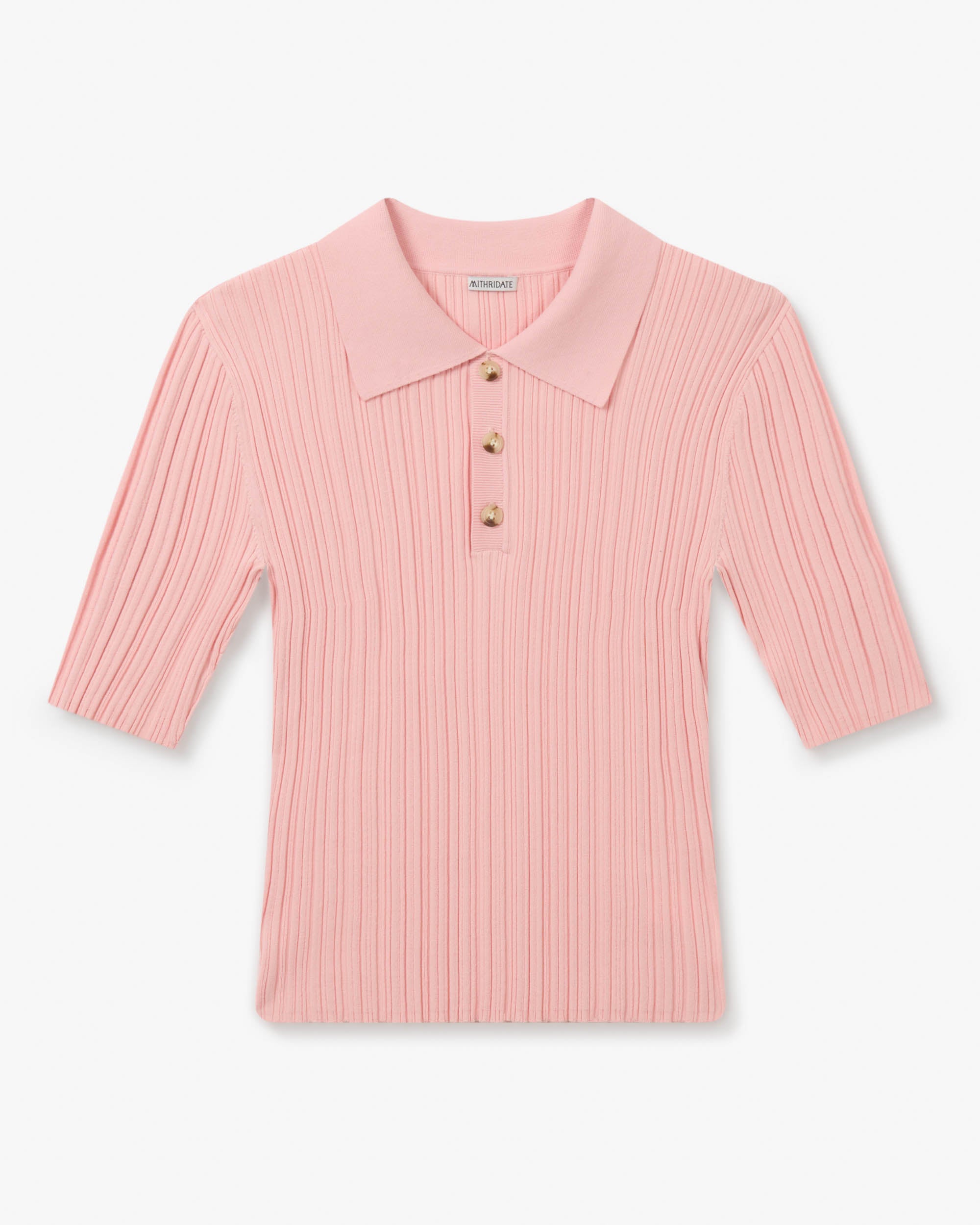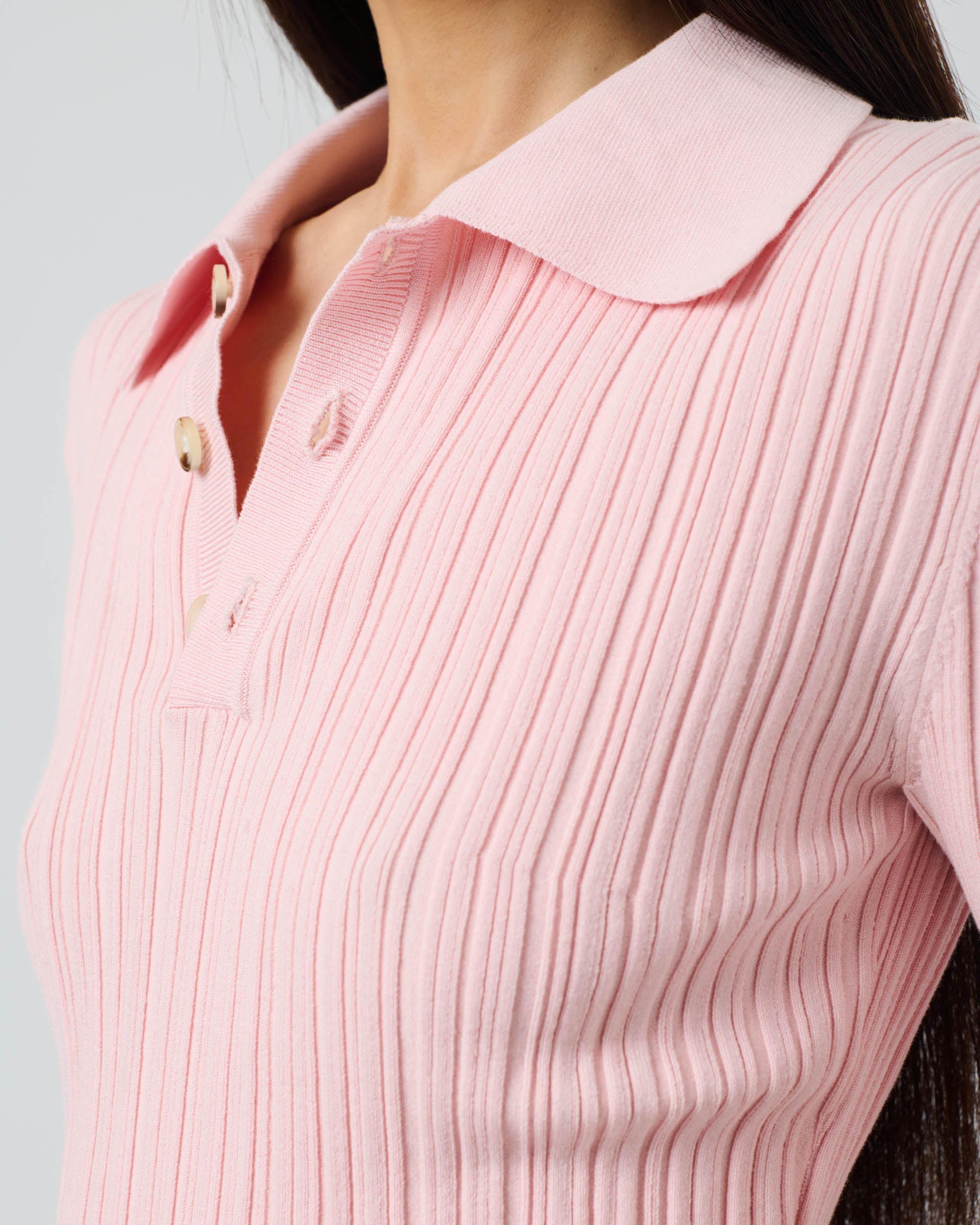 View Similar ProductsShort sleeve rib knitted polo shirt featuring classic collar and ¾ length shell buttons. Cut to a fitted style and below waist.
