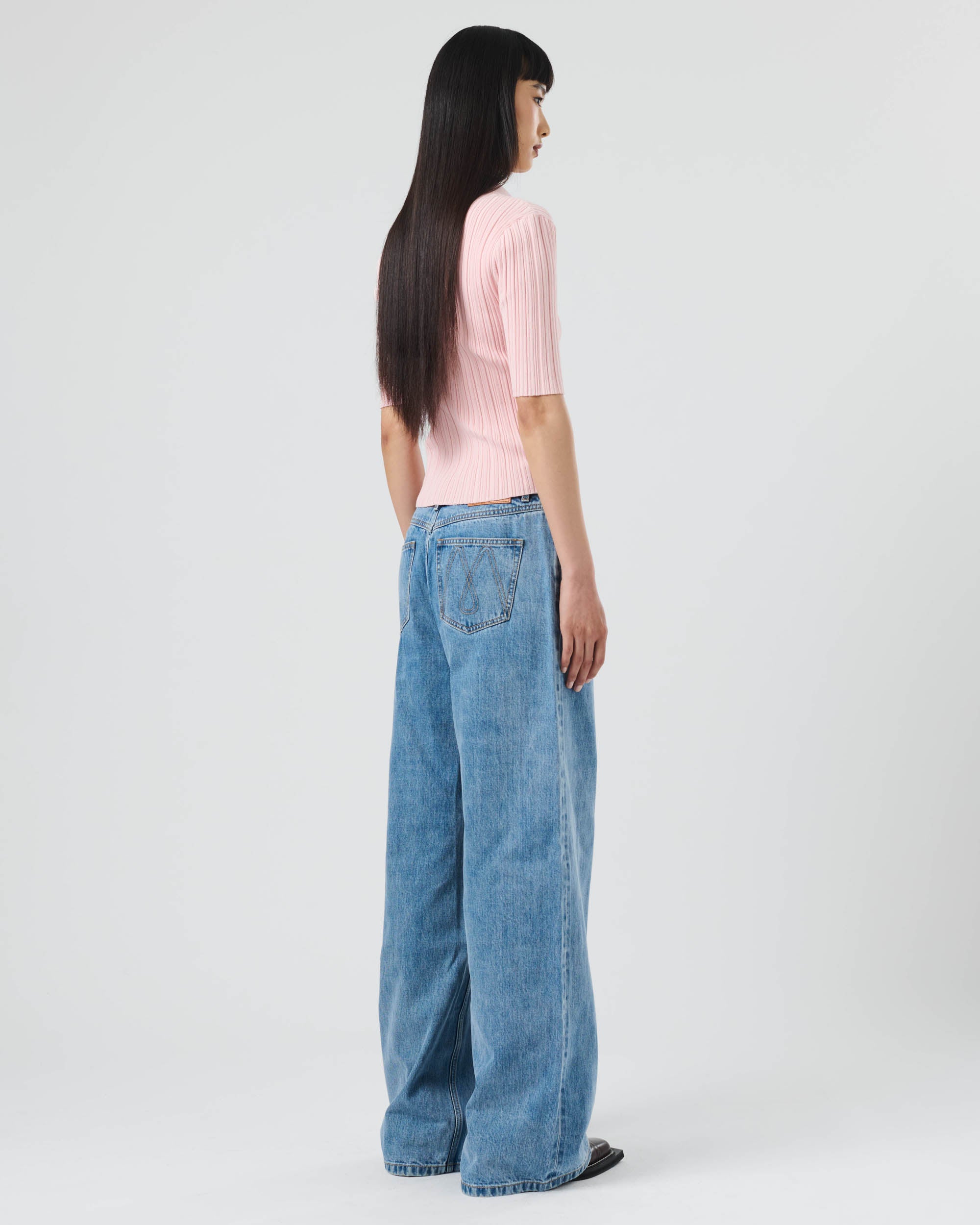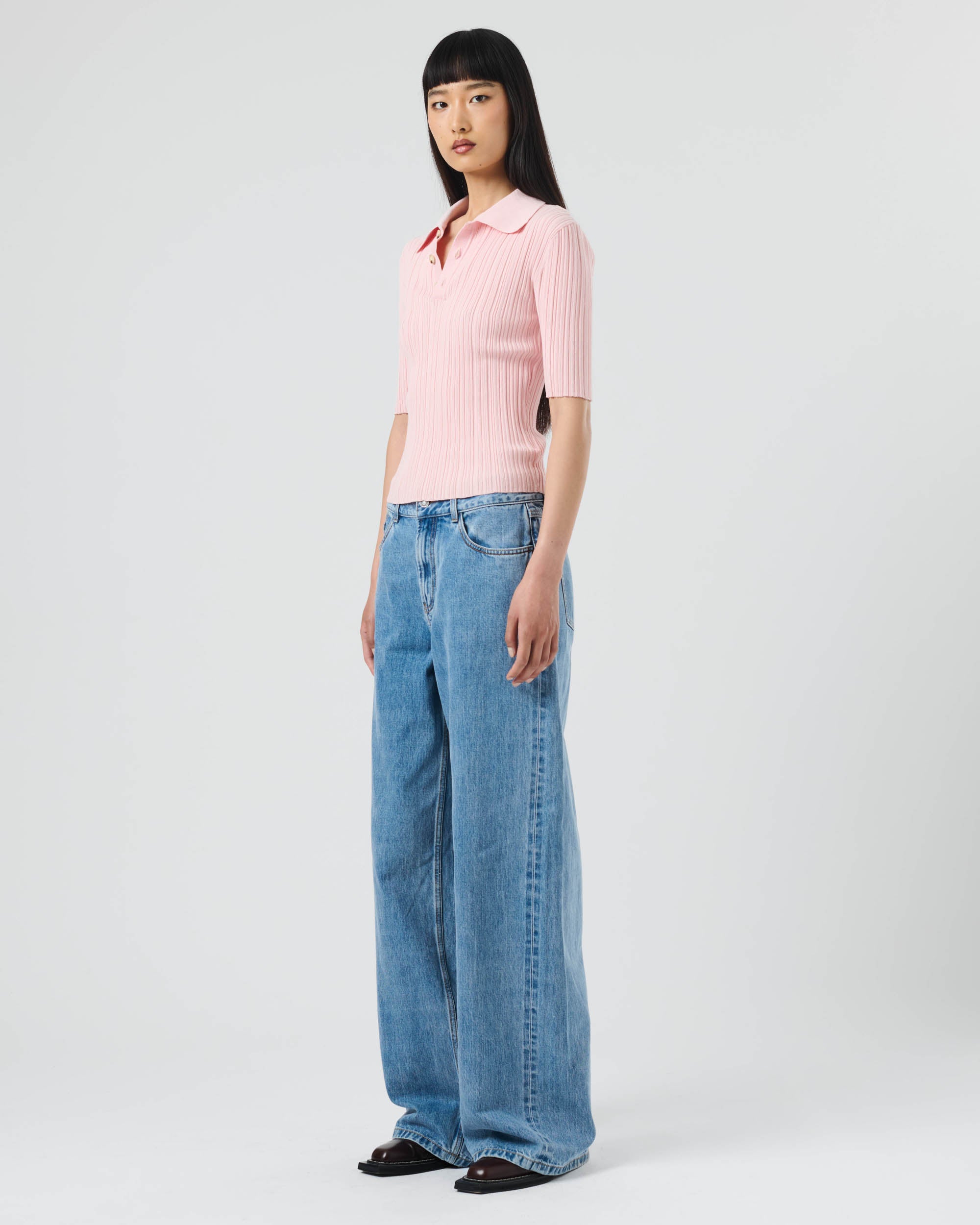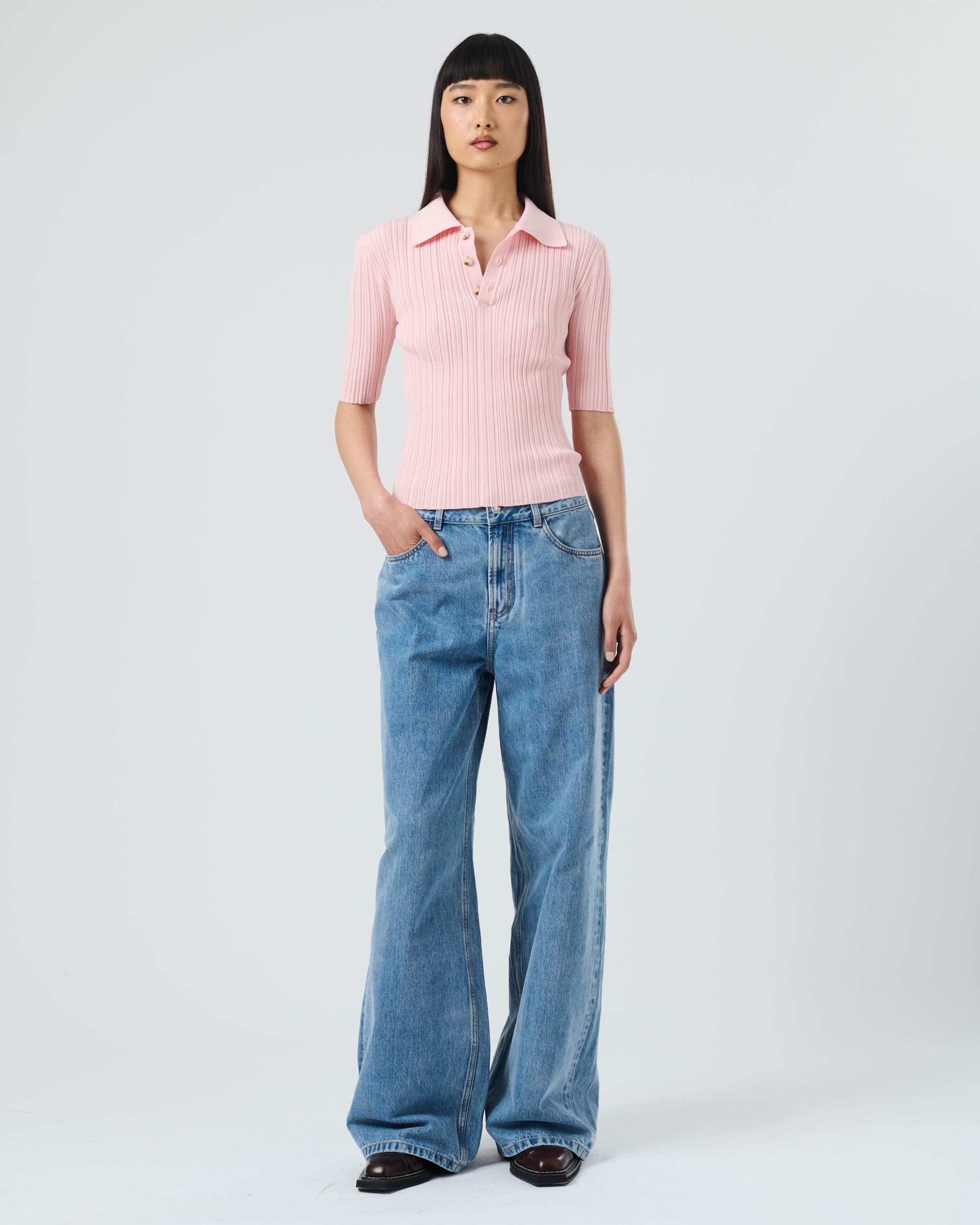 View Similar ProductsShort sleeve rib knitted polo shirt featuring classic collar and ¾ length shell buttons. Cut to a fitted style and below waist.