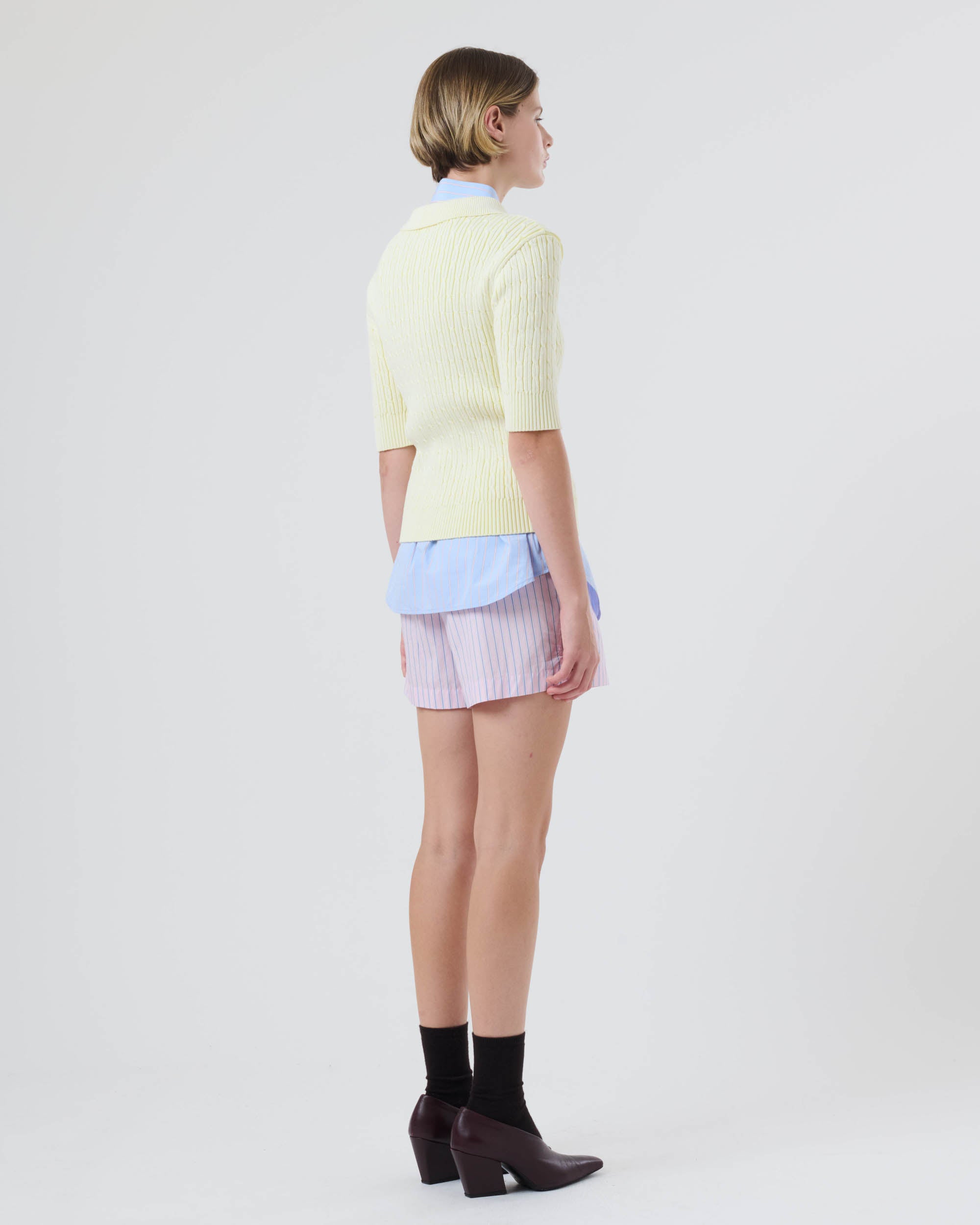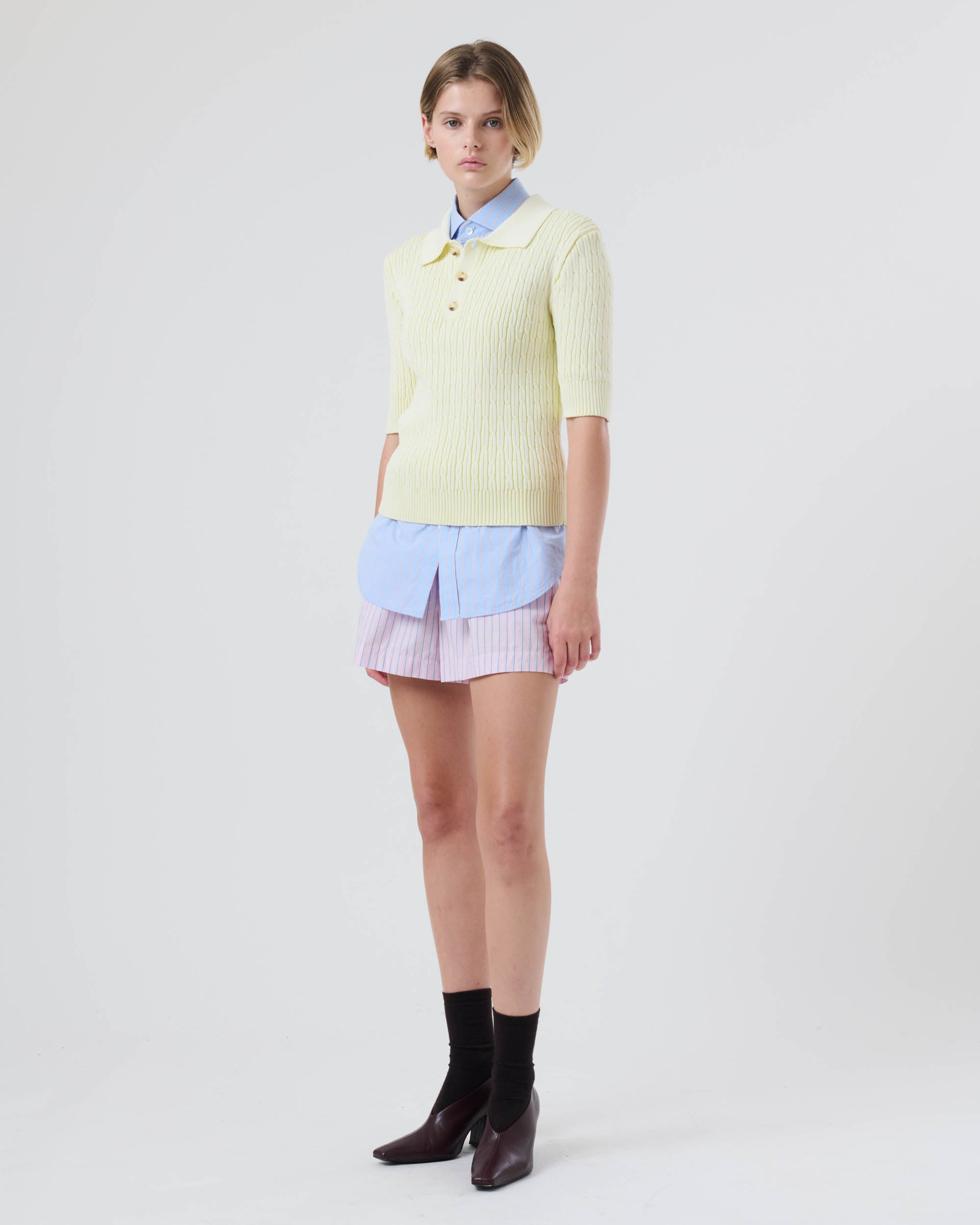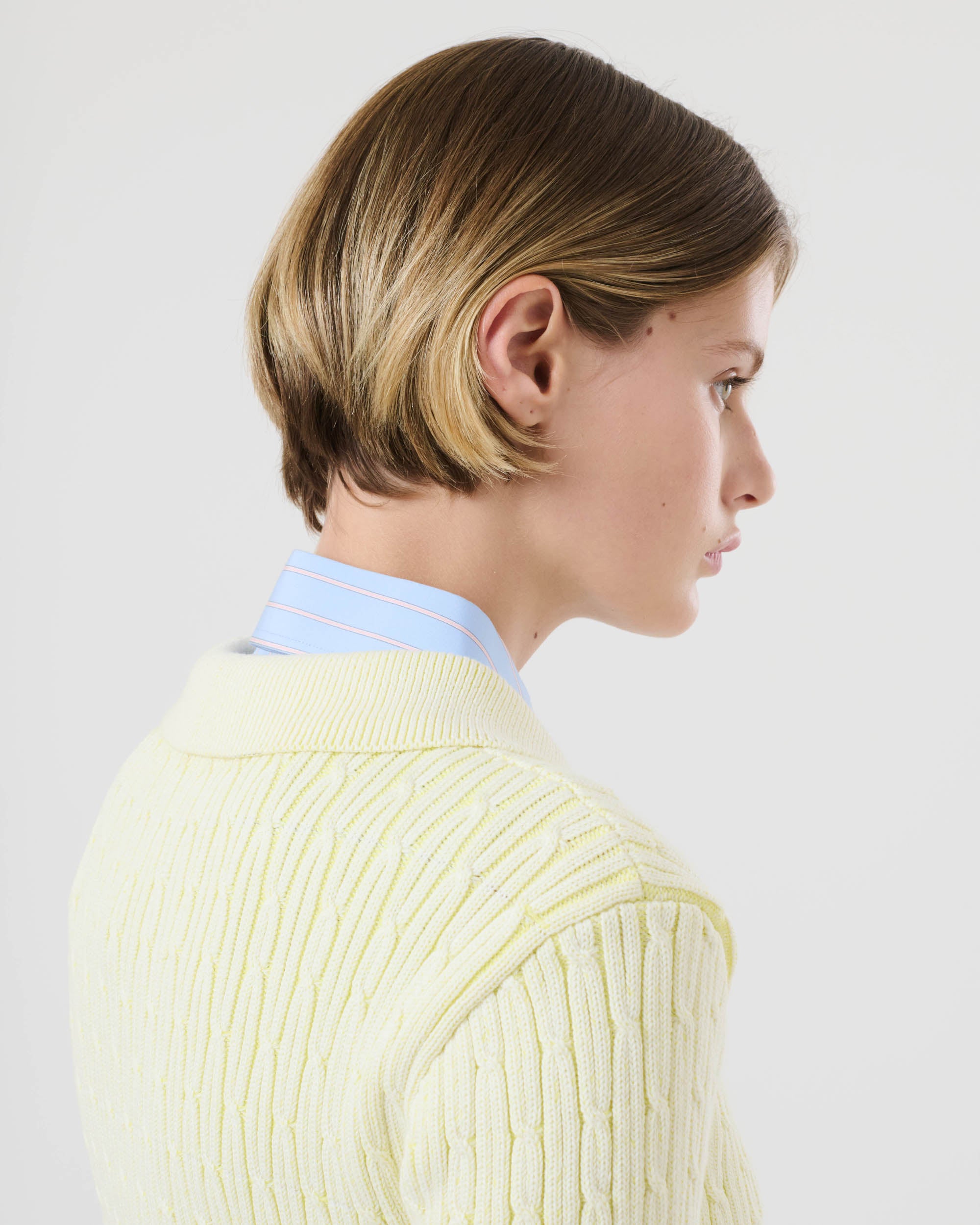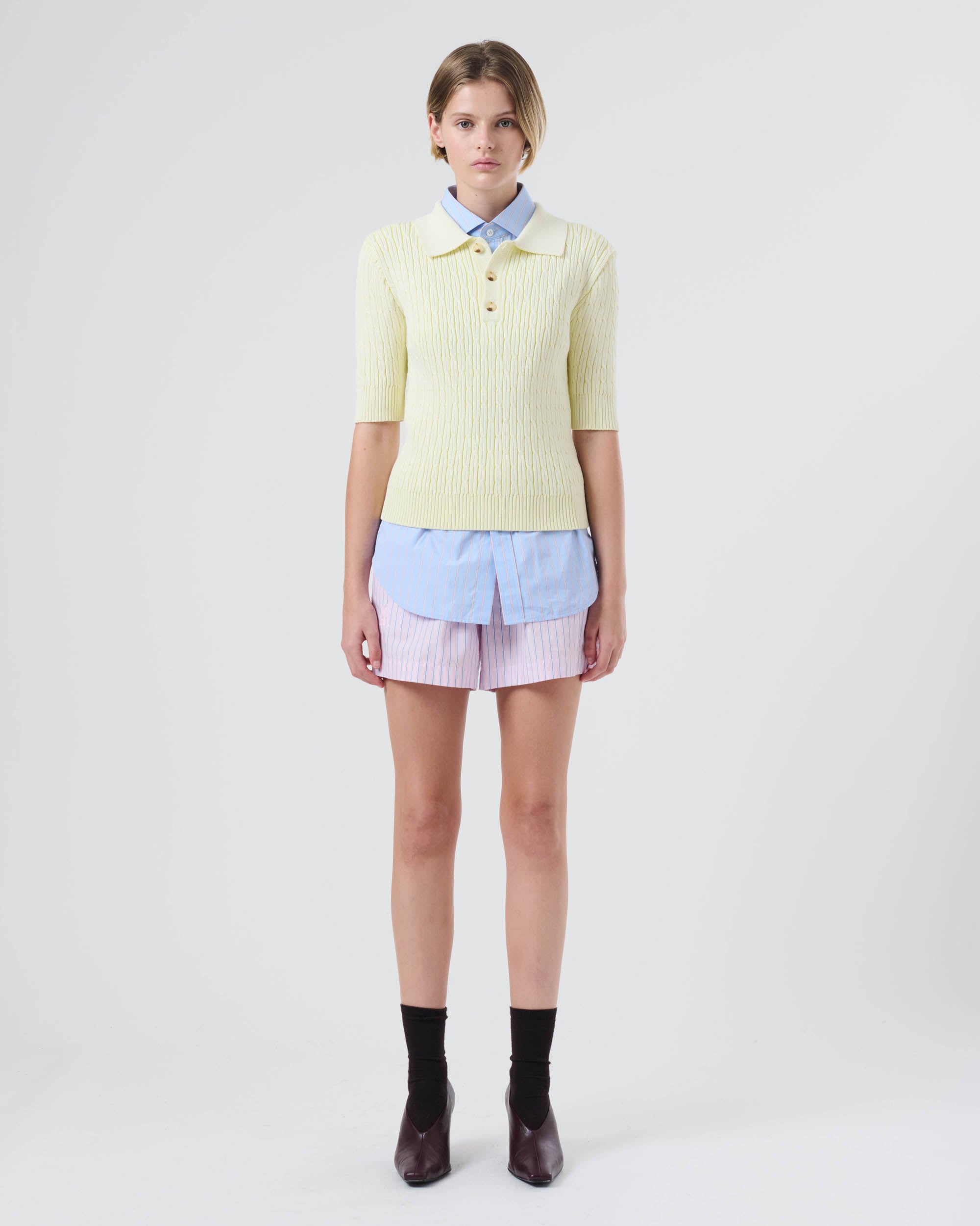 View Similar ProductsShort sleeve cable knitted polo top finished with ribbed cuffs and shirt-style collar. Cut to a fitted style and below waist.