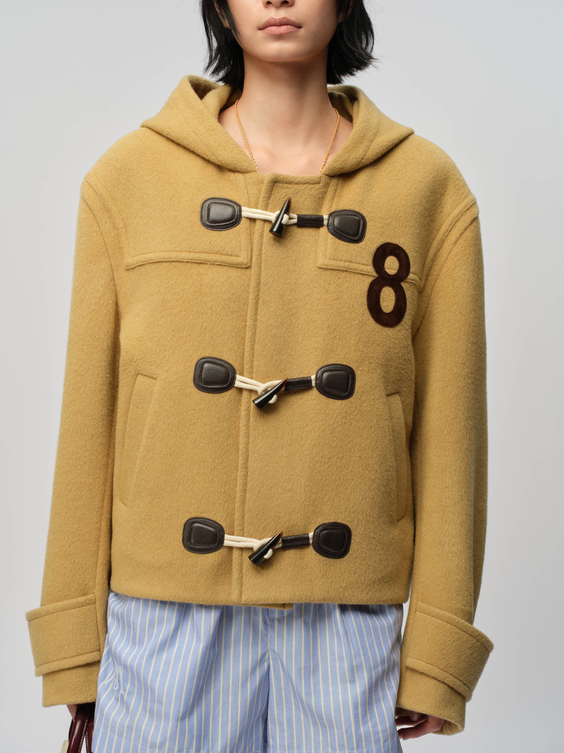 View Similar ProductsHooded Peter coat crafted from heavyweight wool. Features three rows of exaggerated toggle closures. Cut to a relaxed fit with a straight silhouette and mid-length hem.