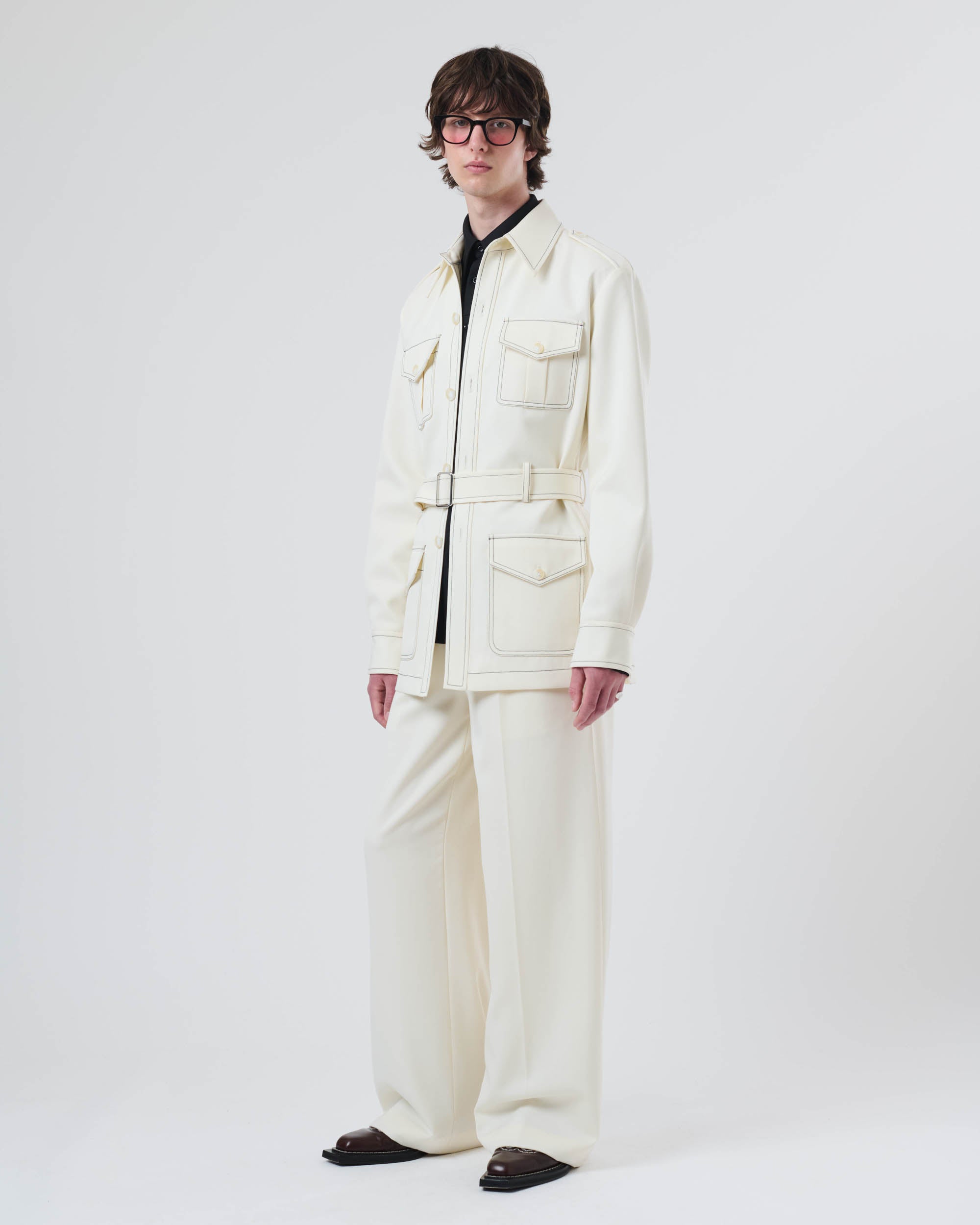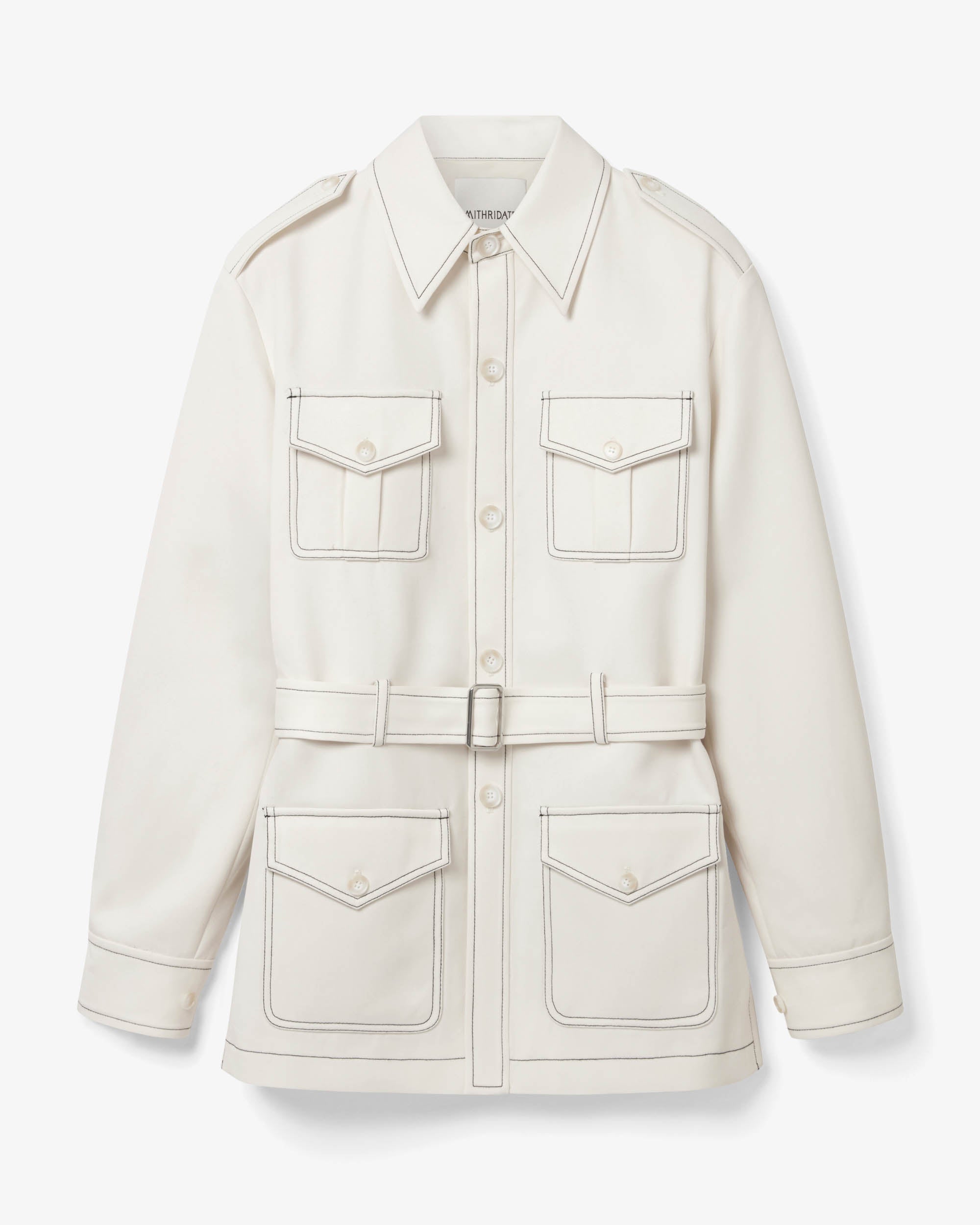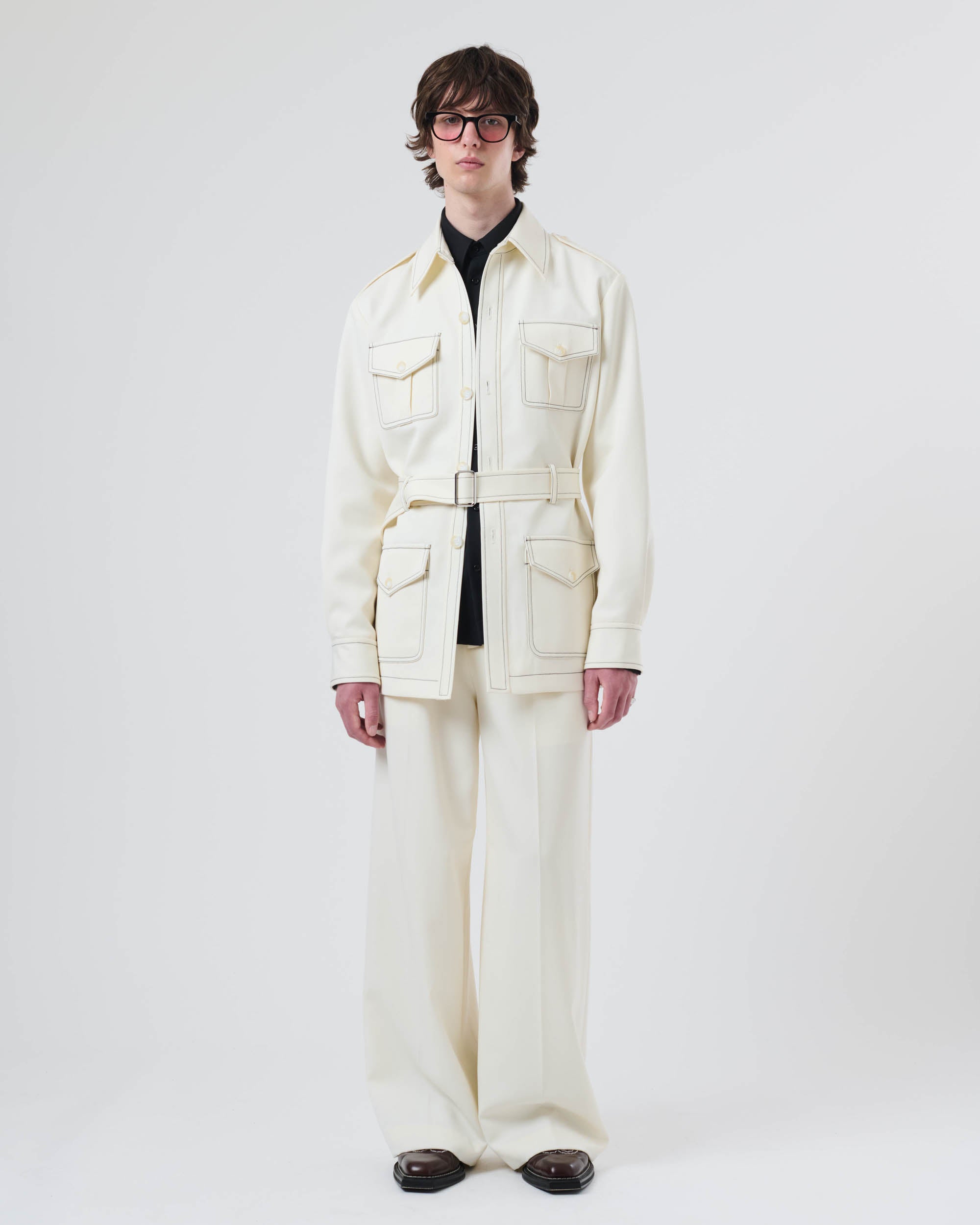 View Similar ProductsSafari jacket crafted from 100% wool featuring contrast stitching, four front patch pockets, epaulettes at the shoulders and a detachable self belt at the waist. Cut to a regular fit and below hip length.
