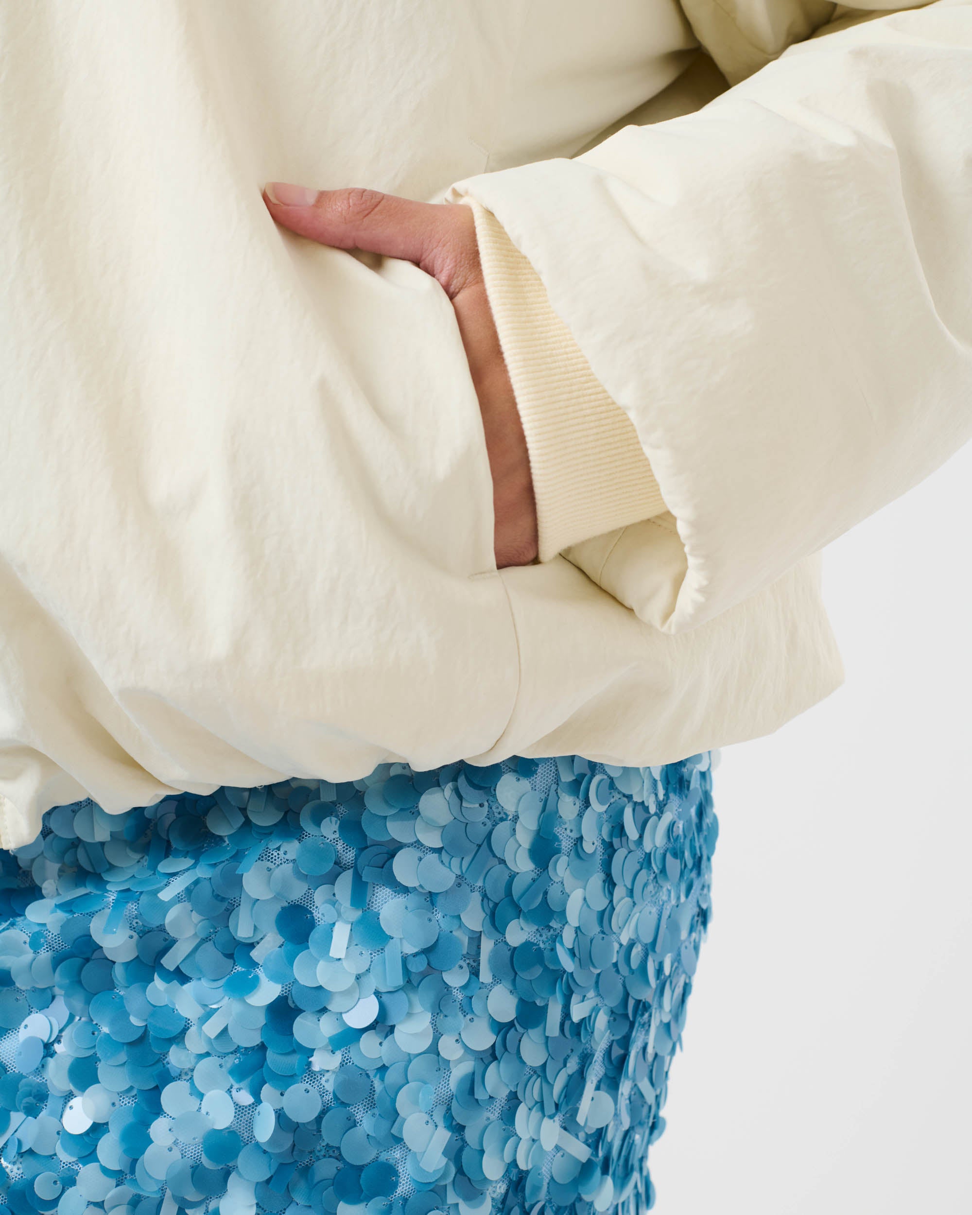 View Similar ProductsCream puffer jacket with an oversized shearling collar. Featuring a centre-front zip closure, gathered hem, and side pockets. Cut to a relaxed fit and finishing just below hip length.