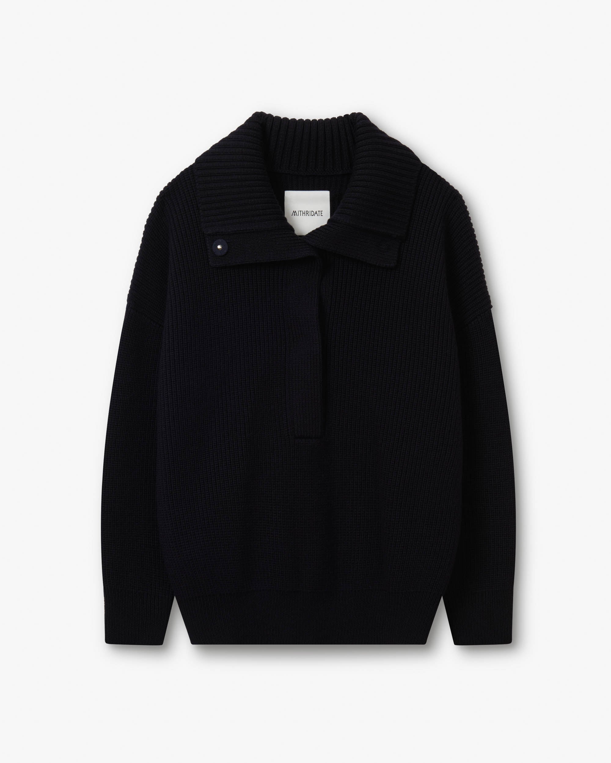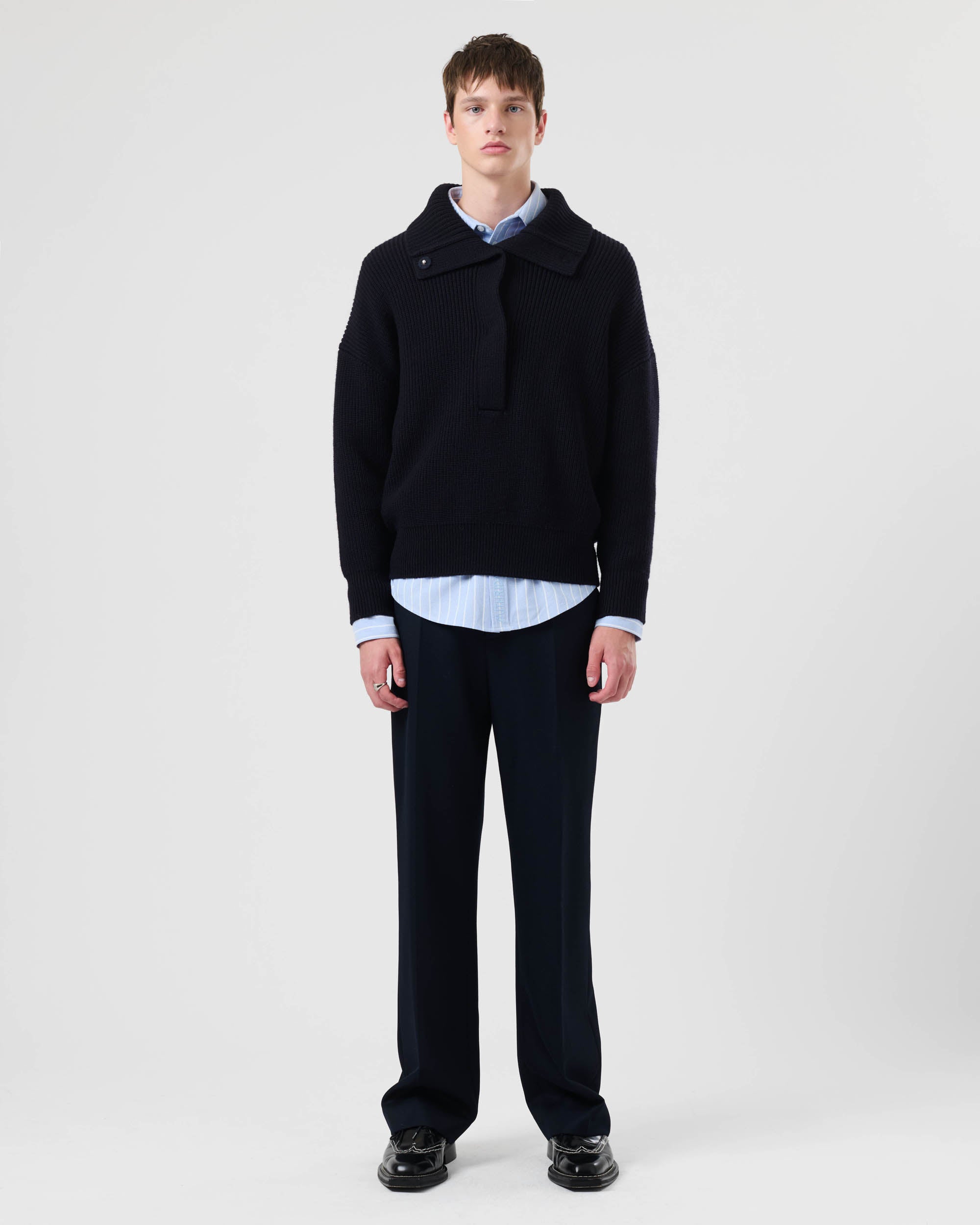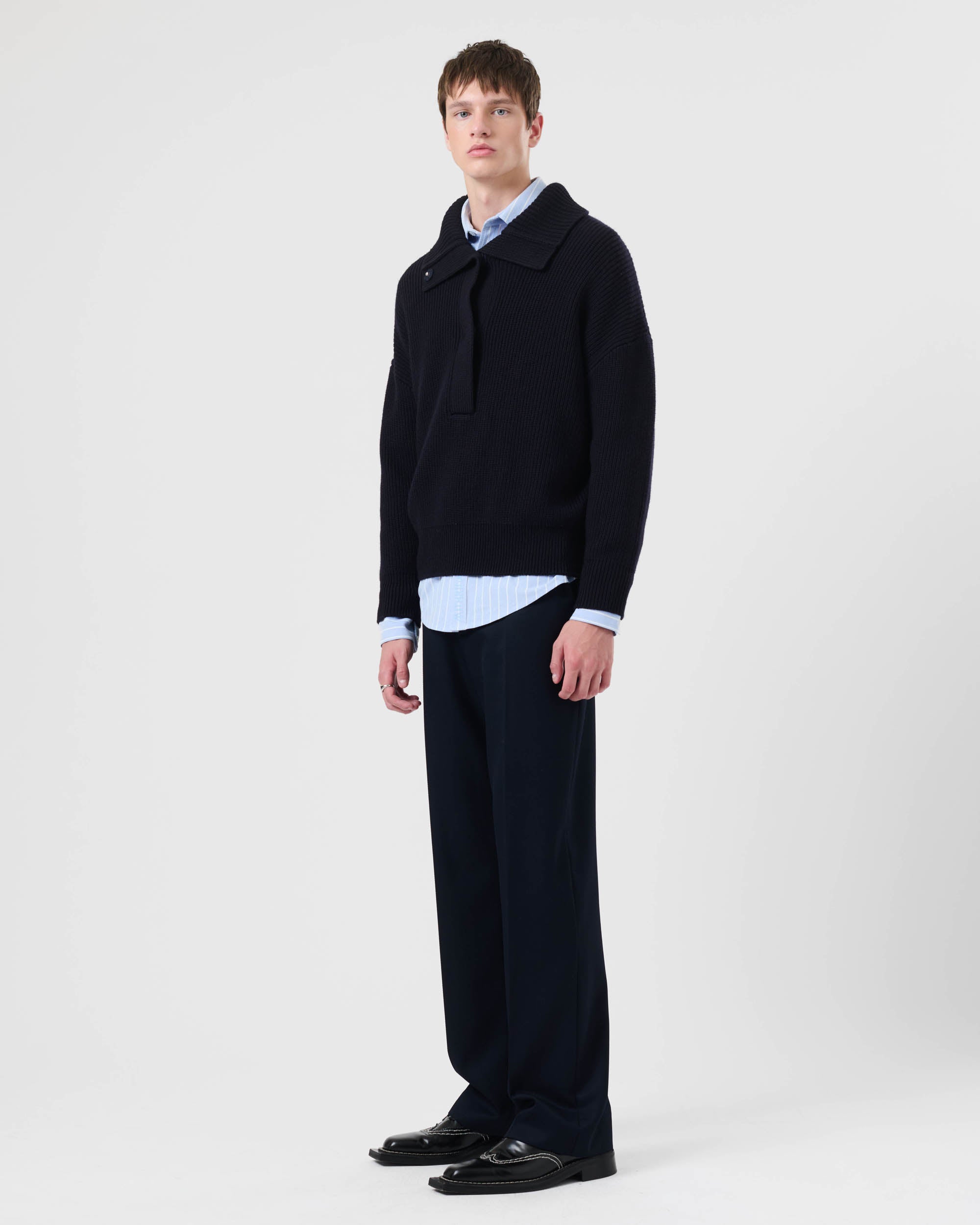 View Similar ProductsChunky ribbed knit sweater made from 100% wool. Featuring 3/4 placket and ribbed collar, cuff and hem. Cut to a regular fit and hip length.