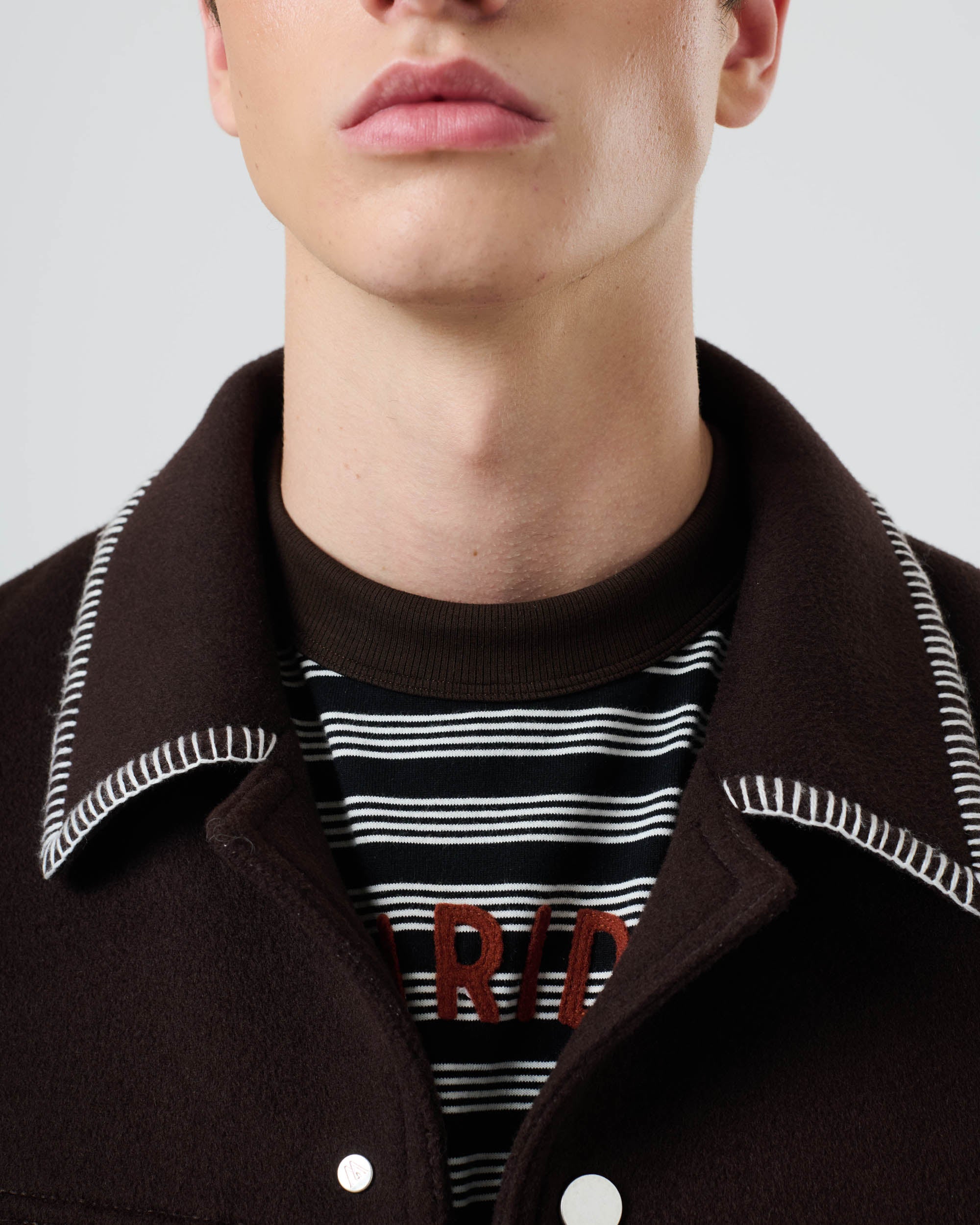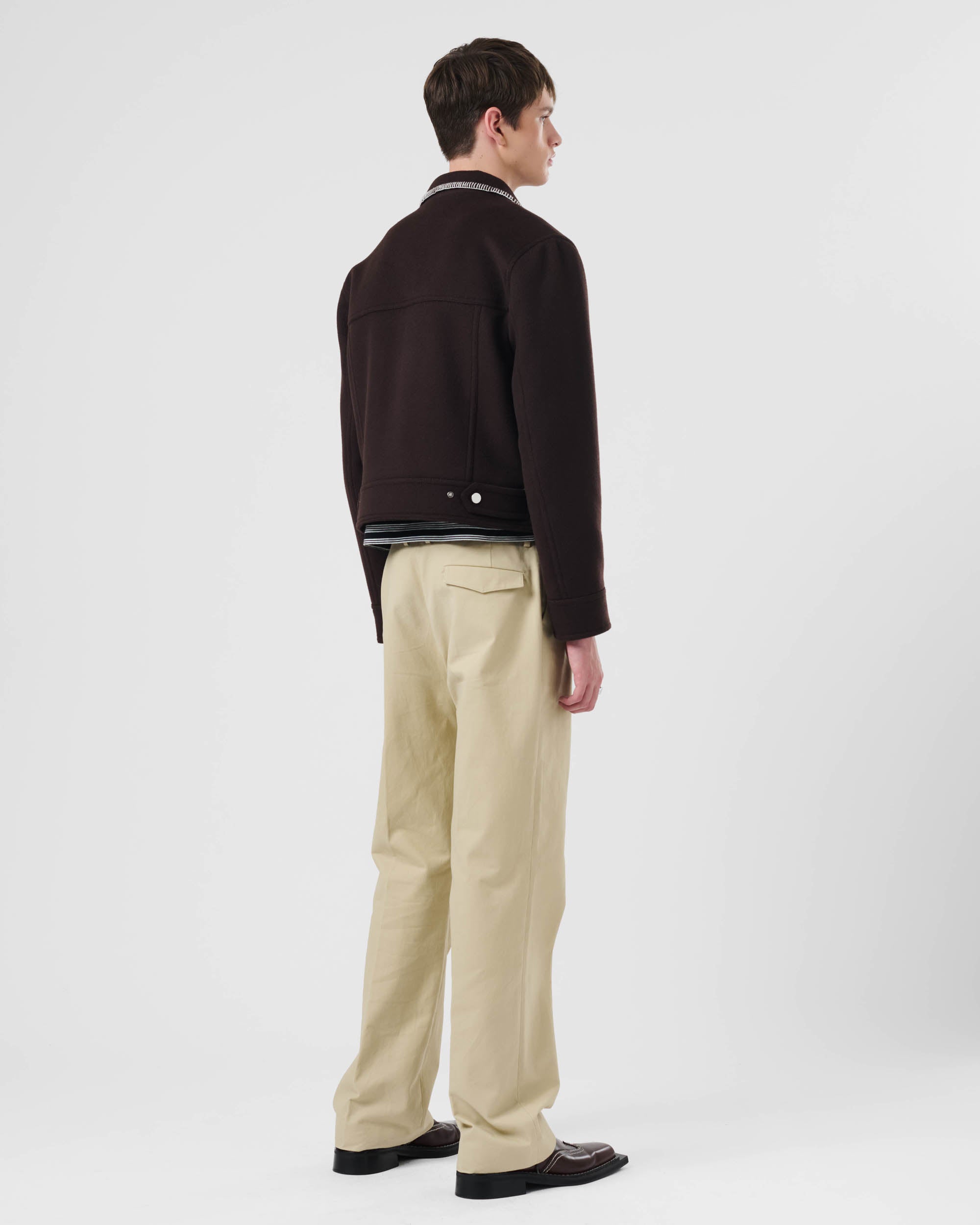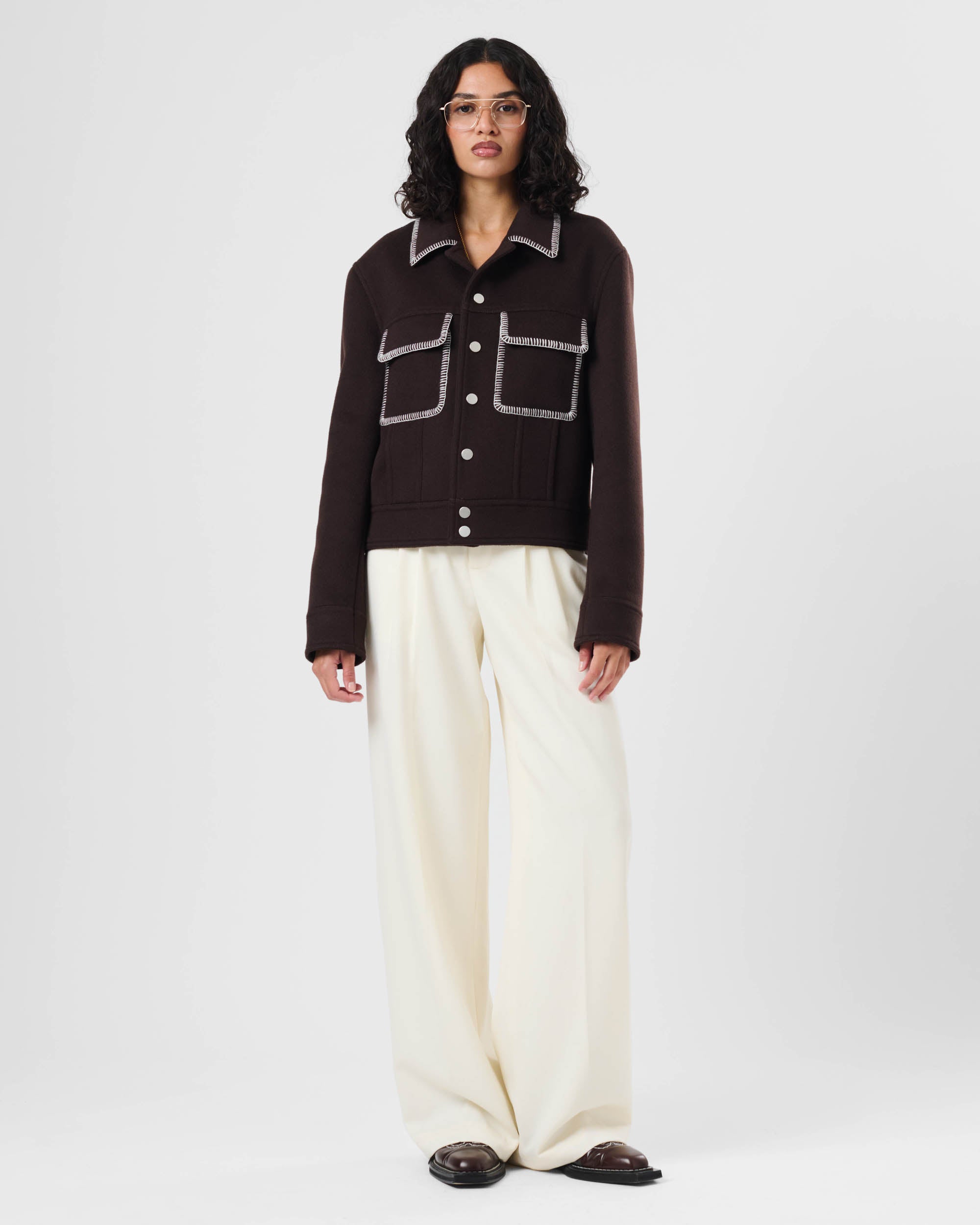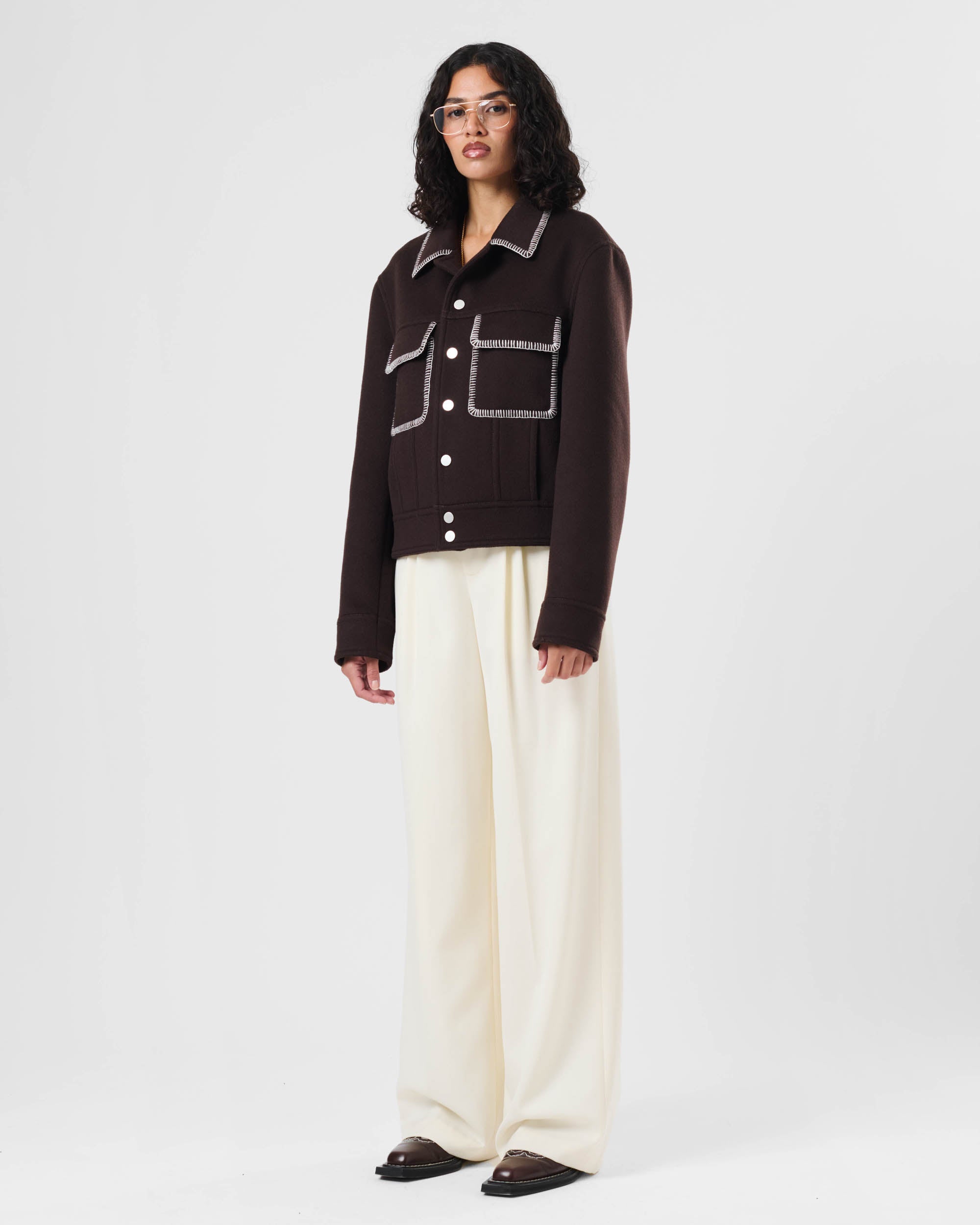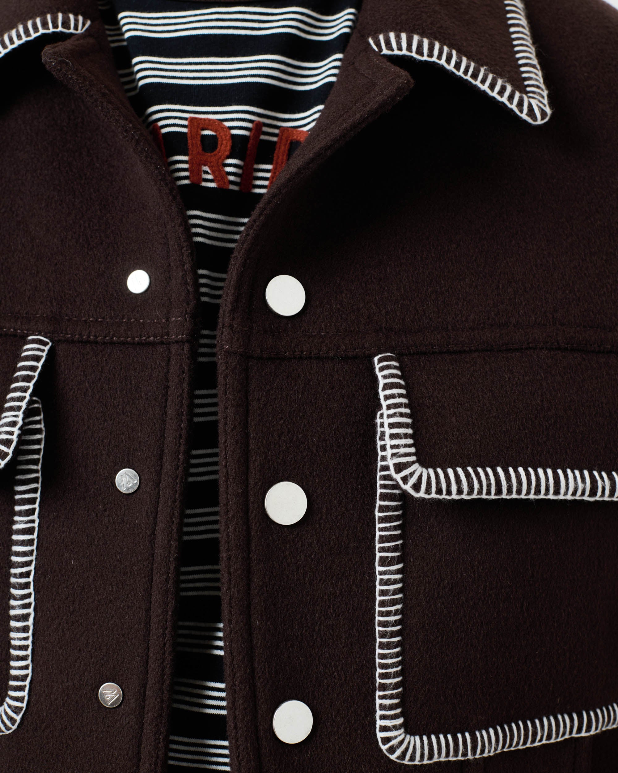 View Similar ProductsThe Tom Trucker Jacket is crafted from a soft wool blend and features contrast blanket stitch edging around the pockets and collar. Complete with centre front snap fastenings and patch pockets. Cut to a relaxed fit and hip length.